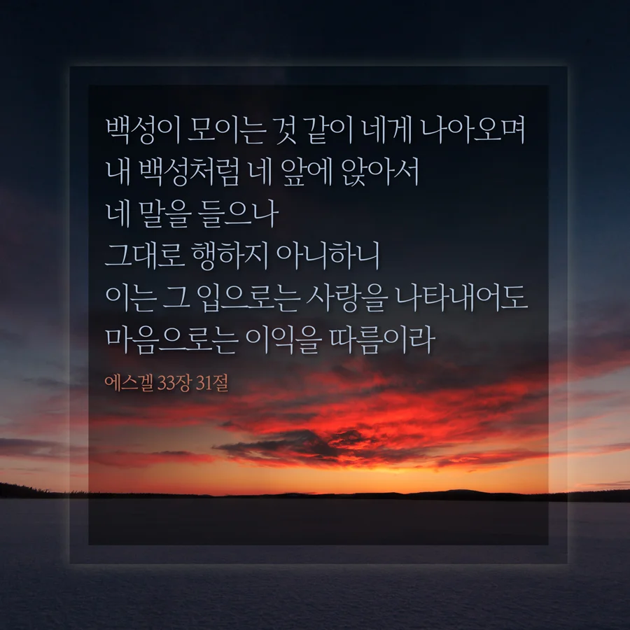 백성이 모이는 것 같이 네게 나아오며 내 백성처럼 네 앞에 앉아서 네 말을 들으나 그대로 행하지 아니하니 이는 그 입으로는 사랑을 나타내어도 마음으로는 이익을 따름이라  (에스겔 33장 31절)